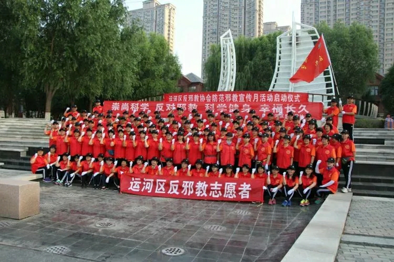 运河区反邪教协会的志愿者们齐聚滨河公园,以自己独特的方式庆祝党的生日